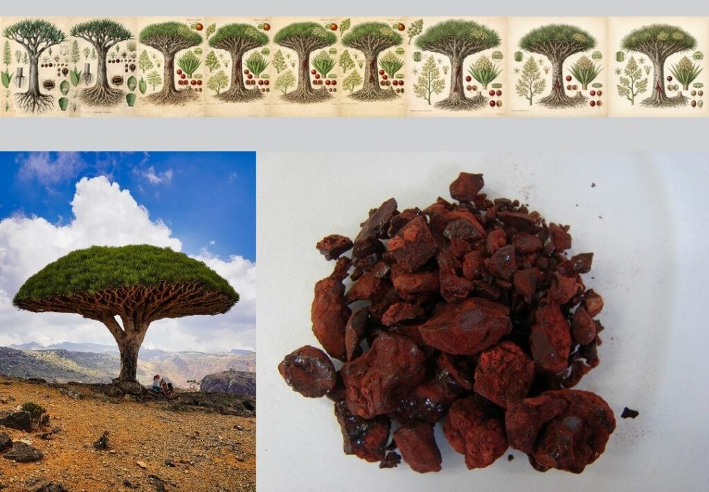 Depuis l’Antiquité, le dragonnier est connu pour sa précieuse résine rouge, appelée sang-dragon. Utilisée depuis des siècles dans les médecines traditionnelles, les pratiques rituelles et l’alchimie, cette résine servait également de colorant naturel et faisait l’objet d’un commerce florissant dans le monde antique.