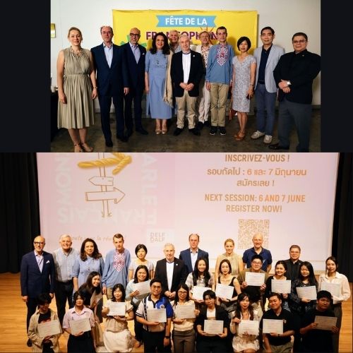 Le samedi 28 mars 2026, en collaboration avec l’Ambassade de France en Thaïlande, l’Alliance Française de Bangkok a célébré la journée de clôture du Mois de la Francophonie. Cet événement a réuni un large public venu célébrer la richesse culturelle et linguistique du monde francophone. À cette occasion, plusieurs ambassadeurs et représentants ont visité les stands gastronomiques, permettant au public de découvrir une grande diversité de spécialités culinaires et d’explorer les saveurs du monde francophone. La journée a également été ponctuée par la cérémonie officielle de remise des diplômes du DELF-DALF, mettant à l’honneur les apprenants de français en Thaïlande et saluant leur engagement. Le programme culturel comprenait aussi des projections de courts-métrages, l’avant-première du documentaire Destination Francophonie en Thaïlande produit par TV5MONDE, ainsi qu’une performance de Khon intitulée at(h)om. Source: https://th.diplomatie.gouv.fr/fr/cloture-du-mois-de-la-francophonie-en-thailande