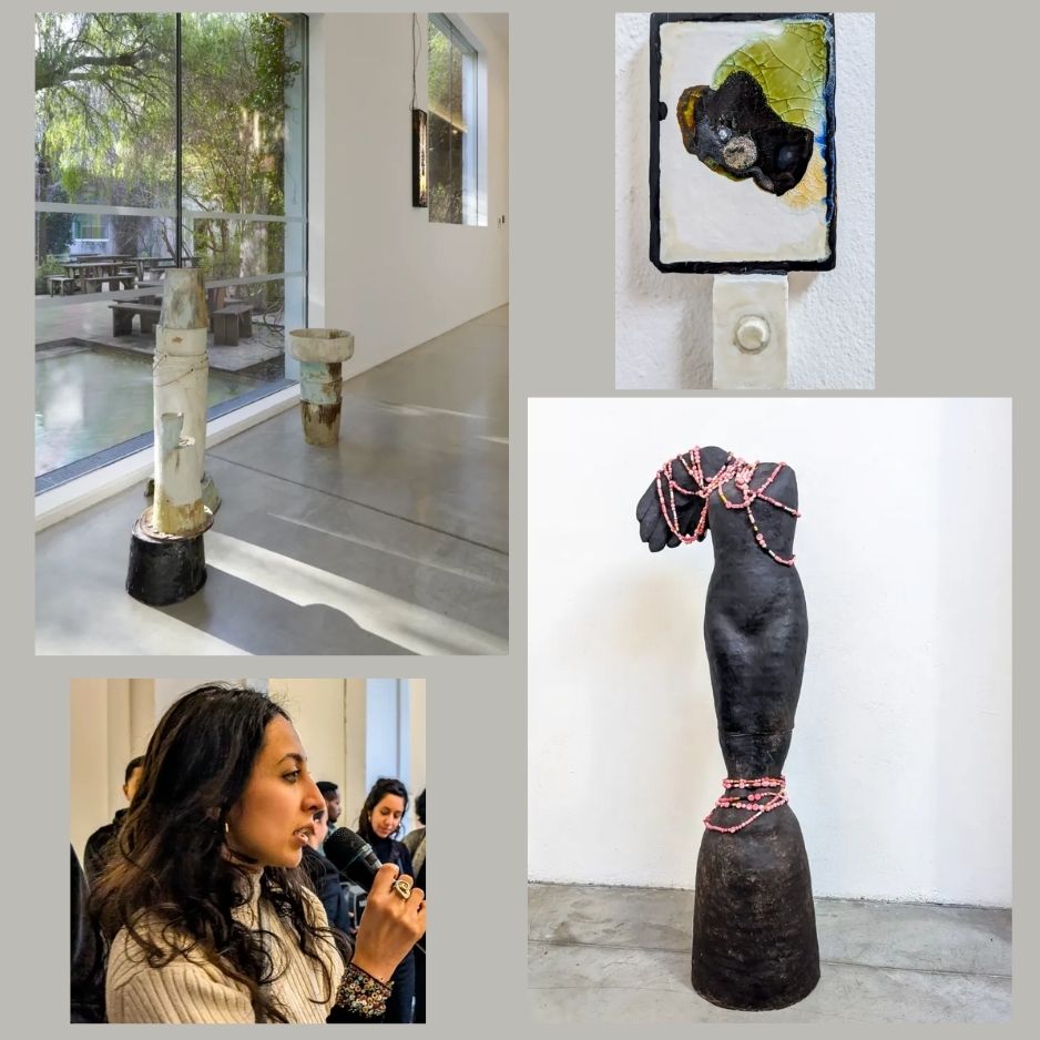 Son travail entre en résonance avec certaines œuvres de l’exposition, notamment celles jouant sur les tensions entre le profane et le spirituel, ou encore sur les récits liés aux lieux et à leurs histoires. Des formes évoquant des objets usuels détournés — comme des seaux devenant réceptacles symboliques — participent à cette réflexion sur les fractures contemporaines et les mythologies marginales.