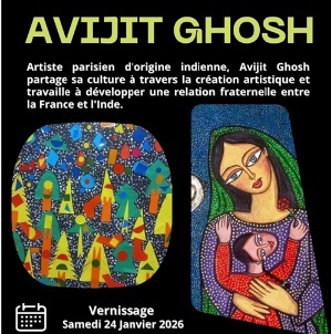 🎨 Avijit Ghosh est un artiste peintre et créateur indien basé à Paris, né à Chandernagor (État du Bengale-Occidental, Inde) vers la fin des années 1970. Il est reconnu pour son travail qui fusionne traditions picturales indiennes avec des thèmes culturels et mythologiques mondiaux, souvent en relation avec l’art narratif et le dialogue interculturel. (Perspectives Asiennes) IL travaille à créer une relation fraternelle entre L’Inde et la France Venez le retrouver du 10Janvier au 20 Février au Centre Paris Anim Dunois